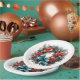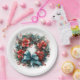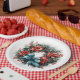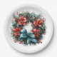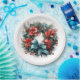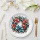 Paper plates with a pretty Christmas wreath. A festive image with a pine wreath decorated with red flowers, holly and a lovely blue bow. Delightful.
