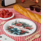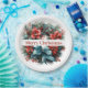 Paper plates with a pretty Christmas wreath. A festive image with a pine wreath decorated with red flowers, holly and a lovely blue bow. Delightful.