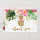 This summery bridal shower thank you card has beautiful tropical watercolor flowers with faux gold glitter confetti and a faux gold glitter pineapple. Coordinating gold calligraphy compliments the lovely floral design.