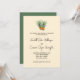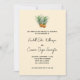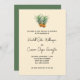 Pineapples minimalist wedding invitation. Pale orange-yellow colour with modern script and printed fonts, this invitation offers paper upgrades and also a download option. Two little pineapples are the design at the top, with templates in handwritten script for names of the couple. Reverse is solid dark green.