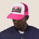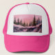 Pines on a snow covered ridge in pink sunrise trucker hat