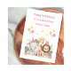 This pink watercolour first birthday card is suitable for a single child or twins. The design includes safari leaves, birthday balloons, stars, a giraffe, an elephant wearing a party hat, and a lion wearing a party hat. All text is fully customisable.