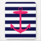 A bright, neon pink silhouette of an anchor is on a navy blue and white striped background. A fun, nautical design.