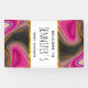 A baby shower banner with a groovy looking abstract design. Pink and black colours mix and mingle together in a swirling motion. Sprinkles of faux gold glitter in between the layers. A white rectangle frame with a faux gold foil border, layered over top with your personalised text inside.