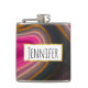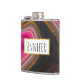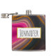 A flask with a groovy looking abstract design. Pink and black colours mix and mingle together in a swirling motion. Sprinkles of faux gold glitter in between the layers. A white rectangle frame with a faux gold foil border, layered over top with your personalised text inside.