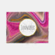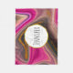 Blanket with a groovy looking abstract design. Pink and black colours mix and mingle together in a swirling motion. Sprinkles of faux gold glitter in between the layers. A white circle frame with a faux gold foil border, layered over top with your personalised monogram initial and name inside.