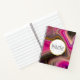 Spiral notebook with a groovy looking abstract design. Pink and black colours mix and mingle together in a swirling motion. Sprinkles of faux gold glitter in between the layers. A white circle frame with a faux gold foil border, layered over top with your personalised monogram initial and name inside.