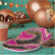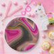 Paper plates with a groovy looking abstract design. Pink and black colours mix and mingle together in a swirling motion. Sprinkles of faux gold glitter in between the layers.