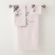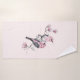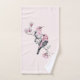 Towel set with a watercolor painting. 2 pink and black birds sitting on a tree branch with pink blossoms.