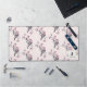 Desk mat with a watercolor painting. 2 pink and black birds sitting on a tree branch with pink blossoms.