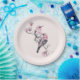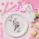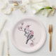 Paper plates with a watercolor painting. 2 pink and black birds sitting on a tree branch with pink blossoms.