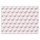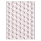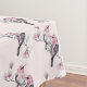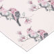 Patterned tablecloth with a watercolor painting. 2 pink and black birds sitting on a tree branch with pink blossoms.