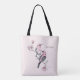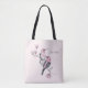 Tote bag with a watercolor painting. 2 pink and black birds sitting on a tree branch with pink blossoms.