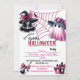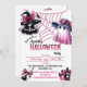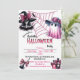 This playful and chic Halloween party invitation features a stylish combination of pink and black, perfect for adding a modern twist to your spooky celebrations. The design includes whimsical elements like a ghost and skeleton adorned with pink bows, set against a backdrop of a delicate spider web. The typography is a mix of gothic and playful fonts, making the invitation both fun and easy to read. With clear details about the event's date, time, and location, this invitation is ideal for those looking to host an elegant yet eerie Halloween gathering.