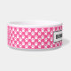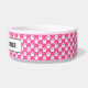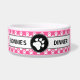 This pet bowl has a white dog paw inside a black circle in the middle. Around it there are two customisable text areas that now read "dinner" and pet's name. The background has a pattern of white dog paw prints on a pink colour. The pink colour can be changed to any other colour under customisation.