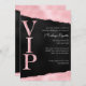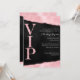This custom party or event invitation features a glamourous pink and black VIP theme. The background has a black foil gradient pattern in the centre, with shiny looking pink foil abstract tears across the top and bottom portion. The VIP title is printed vertically on the left, in a large pink glitter font.