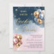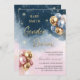 A balloon themed baby Gender Reveal party invitation. On a blue and pink star sky background, bunches of elegant gold, pink and blue balloons are seen floating alongside the gold typography text that reads Baby Your Surname Gender Reveal. Personalise by editing the digital or printed invitation with your event details.