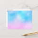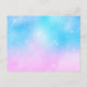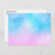 A postcard with a whimsical background. A pastel pink and blue gradient colour scheme. Little white stars scattered around. Whimsical and magical design.