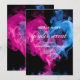 A smoke themed Baby Gender Reveal party invitation template. On a black background, vibrant blue and pink smoke forms a love heart shape around the white text. Personalise by editing the digital or printed invitation with your event details.