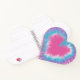 This is a pretty heart shaped tie-dyed pink, light blue , purple and white notebook. Not only is the notebook heart-shaped but the tie-dye pattern is also heart-shaped.This could be used as a teenage girl’s journal.
