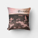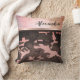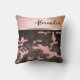 On this stylish pillow is a shimmery pink frosted glass texture along with a pink and black ribbon where above it you can personalise it to make it uniquely your own and below that is a pink and brown camouflage pattern for contrast. Trendy chic vibes.