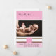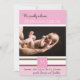 This precious baby announcement design is a wonderful way to celebrate your new arrival. This design has a light pink background blocked with white and brown stripes. In the centre is a place for your personalised photo of your daughter. At the top it says We proudly welcome and your baby's name. Below the photo there is a place for her first initial monogram. To the bottom, there is a place for your baby's birth statistics, and the parent's names.