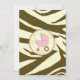 An invitation featuring a brown zebra print background over warm beige with light pink trim. Personalise the brown and pink font text with details of your event. Opposite side is solid zebra print with a pink baby carriage inside a matching circle shaped frame.