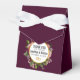 Wedding favour boxes with a dark red burgundy background. Decorated with a circle with a faux gold foil border which is layered over a pretty floral bouquet with roses, carnations and other flowers. Personalise with your text inside the circle. 2 golden wedding bands underneath the text.