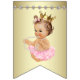 Pink and gold baby shower banner with brunette ballerina princess wearing a string of pearls, pretty gold crown and frilly pink tutu on a pink and gold pearl background with elegant gold script Ribbons & Pearls text. You can change the background colour of the banners and remove the letters to add your own text. This is a printed design with no real glitter, jewels, pearls, etc.