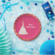 Pretty pink bridal shower paper plate, with gold tone accents, around the edges. Graphics of a bride, decorates the middle of the plate along with custom white text ready to personalise.