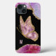 Chic iPhone case with a black background and graphics of pink, lavender and gold glitter looking decorative edge. Graphics of a beautiful gold and pink butterfly decorates the centre. Personalise the pink one letter monogram to suit your needs.
