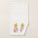 This cute bath towel set features preppy pineapples of tropical pink flowers and gold on a background of polka dots.