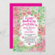 Elegant Baby Shower invitations. Features decorative boarder/background of green and pink floral pattern and animals like elephants, bunnies. To make more changes go to Personalize this template.