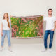 A soft throw blanket in shades of pink and green, including lime and chartreuse, in undulating waves inspired by layered stone patterns. A bright and colourful Boho chic blanket to wrap up in.