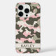 Customize this pink, green and cream camouflage iPhone 16 pro case with your your name in a trendy modern CAP font in dark green on cream. It's so modern, girly and trendy! Perfect for any country girl!