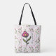 A tote bag with your customised name and pretty pink flower inside a square frame with a pink border. The background is a pattern with hand drawn pink wildflowers with long green stems and leaves on a eggshell white coloured background. Pink circles and sprigs also decorate the design. Whimsical and pretty floral design.