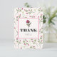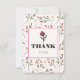 A thank you card with Thank you written inside an eggshell white coloured frame with a pink border. The back has a personal message you can customise. The backdrop is a pattern of hand drawn pink wildflowers with long green stems and leaves on an eggshell white coloured backdrop. Pink circles and sprigs also decorate the design. Whimsical and pretty floral design.