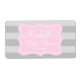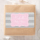 Custom pink and grey baby shower water bottle labels Personalised elegant waterbottle sticker template with striped background and bracket shape. Stylish script typography for name and birth date of baby girl. Use as classy table decoration or thank you favour for guests at the party.