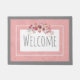 Welcome your guests with a fresh pink and grey doormat. The text "Welcome" is set in grey on a white background. The text is framed inside an image of a delicate watercolor arched floral swag of pink and rose flowers centred above. The doormat is elegantly framed with a grey border.