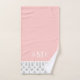 This custom made-to-order bath towel set has a chic modern trellis pattern in blush pink, light grey and white. Personalise it with a classic 3 letter monogram or other custom text. Use the design tools to choose any background colours, edit the text fonts and colours or upload your own photos to create a unique custom set of bath towels to match any bathroom decor. The set includes a coordinating bath towel, hand towel and wash cloth or select individual towel sizes as needed.