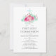 Trendy pink roses first holy communion invitation with mint glitter tropical foliage designed to be quickly and easily customised to your event specifics.