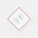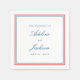 These wedding cocktail napkins feature a simple border of navy blue and pink lines that frame elegant and easy to personalise couple's names and wedding date text with lots of light and airy white space for that high-end look in line with the new traditional grand millennial style.