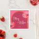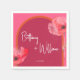 This design features bold pink and orange watercolor floral themed vibrant summer wedding paper napkins with elegant script fonts for couple's name, and clean font for details.