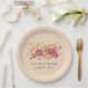 Paper plates for a wedding or other event. Designed with a pretty digital image made from watercolors. Pink and orange flowers in a bouquet with twigs, sprigs and leaves in brown and orange colours. The background is a pretty peach colour.