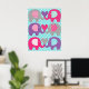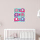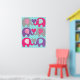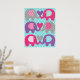 Elephant Love nursery poster features six elephants in grey, pink, and purple with patterned ears ears on a teal blue polka dotted background!
