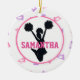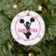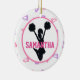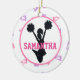Design features a white background with pink and purple megaphone pattern. In the centre is a white circle with pink trim. Inside the circle is a black silhouette of a cheerleader jumping in the air with outstretched arms holding pom poms. Across the centre is a place to personalise with a name in fun pink jersey style font. The reverse side of the ornament has the same pink and purple megaphone pattern. The perfect gift for cheerleaders, cheer coaches, and cheer Moms!