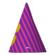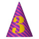 A bold and bright fuchsia and purple striped party hat with a yellow custom age number is a fun addition to any kid's birthday party.