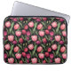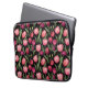 This fabric laptop bag features a design with vibrant pink and red tulip flowers against a dark black background. The lush green tulip leaves add contrast, bringing a fresh pop of colour to the dark background. This bold floral pattern exudes elegance and sophistication and is perfect for anyone who loves a powerful yet refined look. The dark black background creates a stark contrast against the bright pink and red tulips which enhances the vivid colours of the tulips, making the design stand out in the stunning, eye-catching pattern. Tulips are often associated with love and passion and are admired for their simplicity and elegance. In different colours, they carry various meanings: red tulips can represent deep love, while pink tulips can signify happiness and affection.