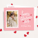 Cute Valentine's Day photo postcard featuring your vertical photo inside of a white postage stamp frame. The phrase "Happy Valentine's Day" is displayed in whimsical, white hand-lettering surrounded by red hearts. Personalise the front of the photo Valentine's Day postcard with your family name in white lettering on a pink background. The postcard reverses to display your return address and personal message in red lettering.