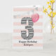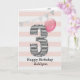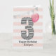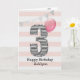 A pink and silver 3rd birthday girl card, which you can personalise with her name. The front of this beautiful 3rd birthday card for her features the number three in a black and white stripe with an outline of glitter with a pink balloon ready to float way. Please note the silver glitter is a design effect and no actual glitter will be on this birthday card. The background is a soft white and pink with a soft silver bunting banner at the top.The inside message can be easily personalised if you wanted. A pretty 3rd birthday card keepsake for her.